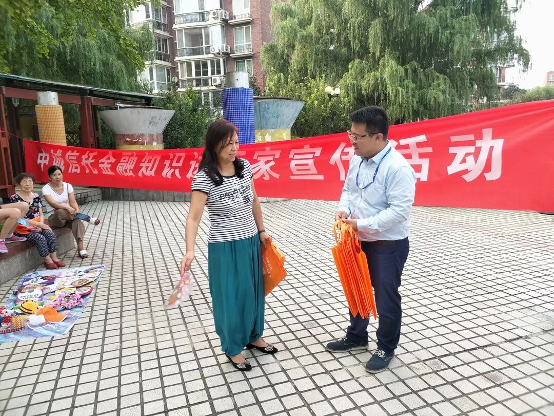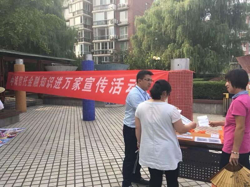 中诚信托为推进“金融知识进万家”宣传教育工作,提高投资者防范风险和正确使用金融服务的意识,2018年8月28日与北京市海淀区美丽园社区中心广场,开展“普及金融知识,追求美好生活”系列社区活动,做为受监管的辖内金融机构,有义务服务实体经济和人民群众,一起营造良好和谐金融环境。